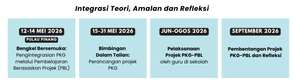 4. Komited untuk melengkapkan penyertaan kesemua komponen dalam program, termasuk menghadiri bengkel secara bersemuka di Pulau Pinang, menghadiri sesi bimbingan dalam talian, menjalankan projek PKG-PBL di sekolah, dan membentang projek dan menjalankan refleksi pada akhir program.